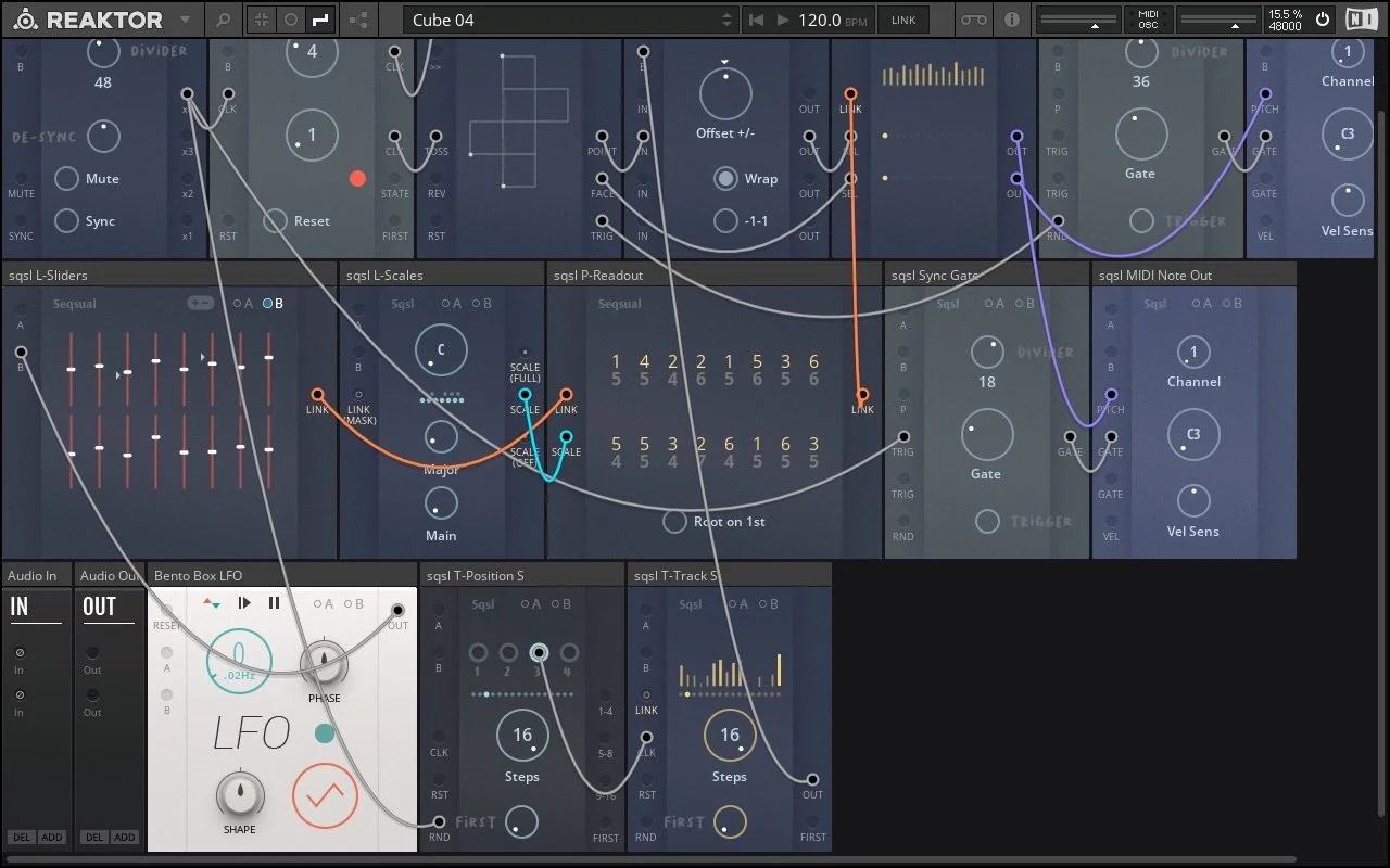 At this stage we have a two-voice structure following cube’s geometry, we are able to set the scale and degrees that are used. By manually adjusting L-Sliders, Clock Router and Wrap Offset settings we can create variation/develop the patch.